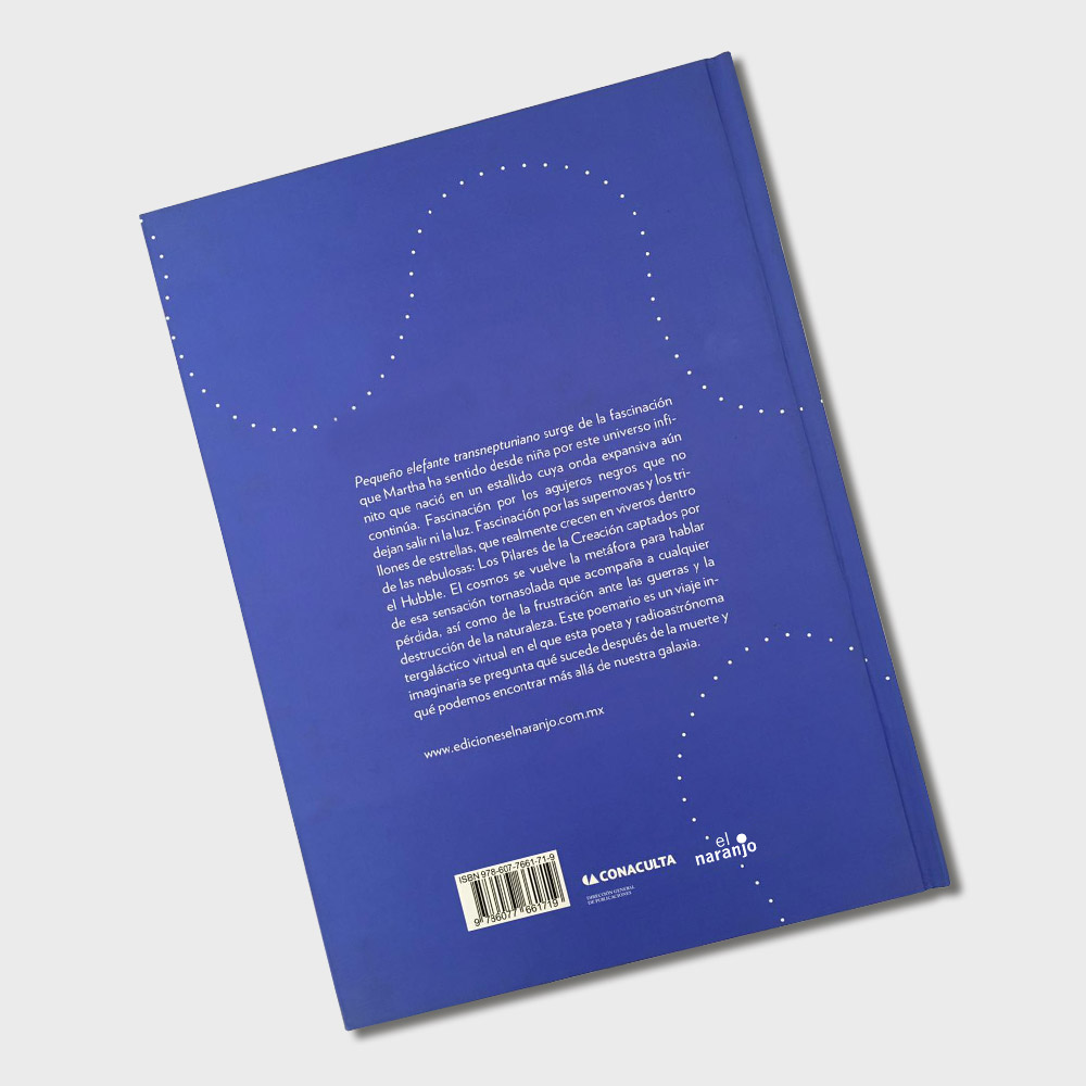 Acompaña al pequeño elefante en un viaje transneptuniano desde lo más profundo del alma hasta los rincones más lejanos del universo, a donde solo se puede llegar con la imaginación y la palabra, para indagar a dónde van las almas de los que acaban de morir y en qué se transforman. Con la belleza y la profundidad del lenguaje poético de este libro, las palabras se vuelcan en imágenes, las imágenes en sueños y los sueños en metáforas sobre la vida y la muerte. Son poemas de polvo sideral, estrellas, aerolitos fluorescentes y planetas para despedir a una niña fantasma y, a la vez, darle la bienvenida a ser parte del Universo.