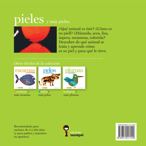 ¿Qué animal es éste? ¿Cómo es su piel? ¿Húmeda, seca, lisa, áspera, escamosa, colorida? Con el desafío de descubrir de qué animal se trata, este libro describe cómo es la piel de algunos animales y para qué les sirve. Texto, información e imágenes unidos para jugar, descubrir y aprender sobre diversidad y adaptación.
