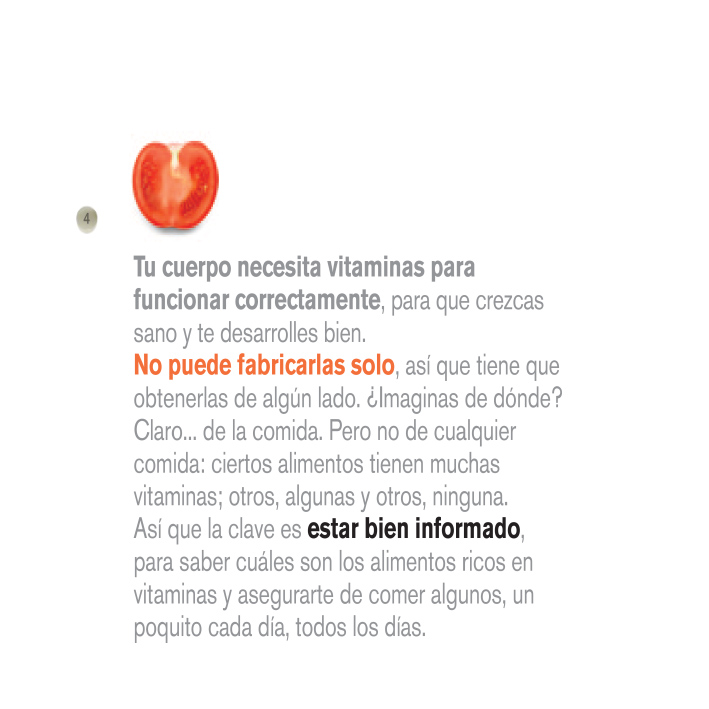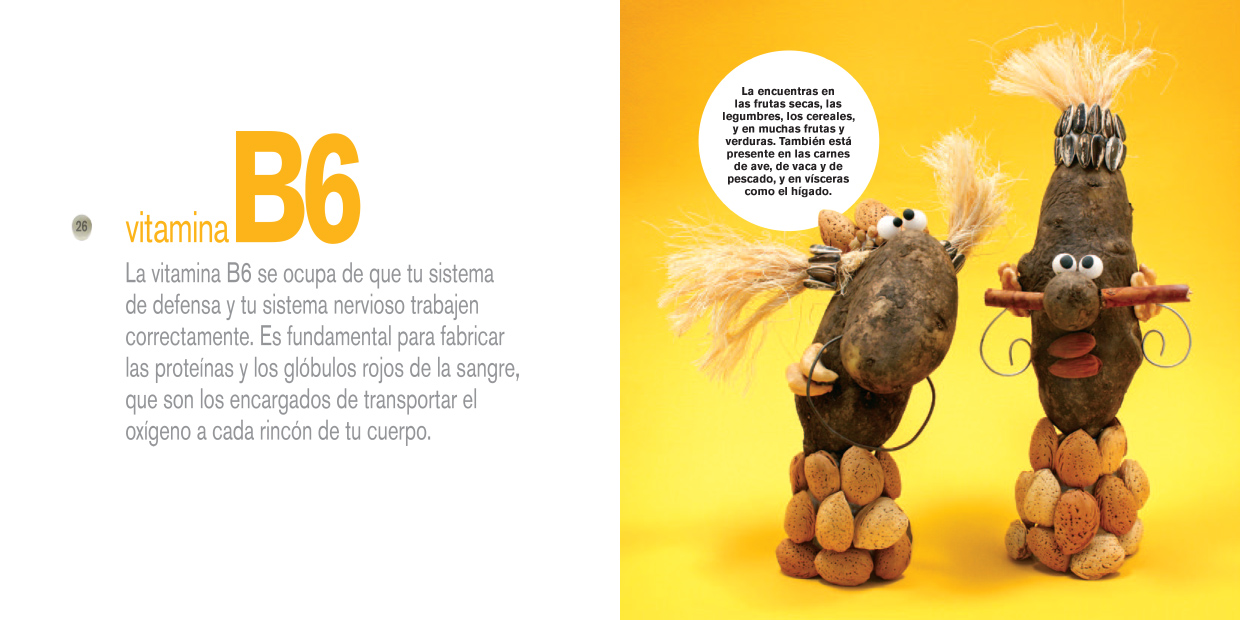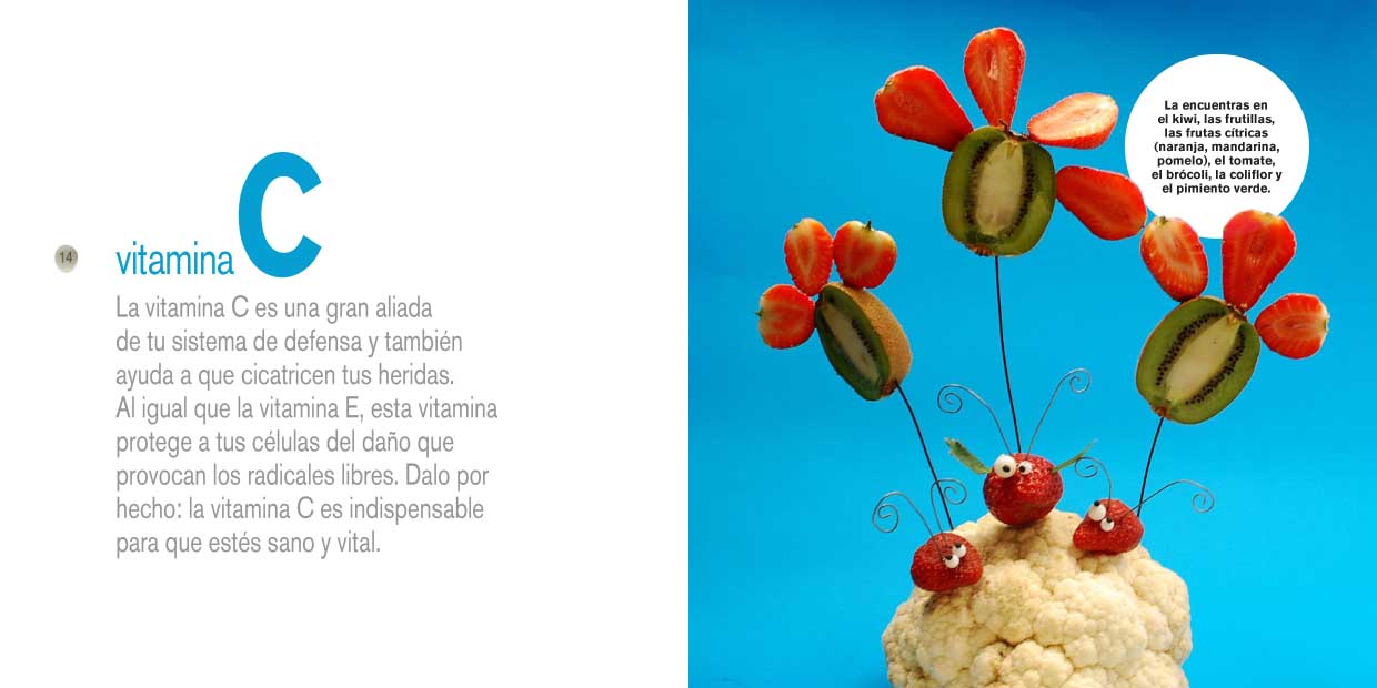 Imágenes divertidas y originales, construidas íntegramente con alimentos, invitan a descubrir qué son y para que sirven las vitaminas. Una propuesta para que los mas pequeños aprendan a alimentarse de forma variada y saludable.